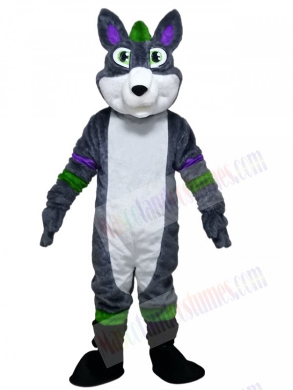 Gray Husky Dog Fursuit with Purple and Green Stripes Mascot Costumes Animal