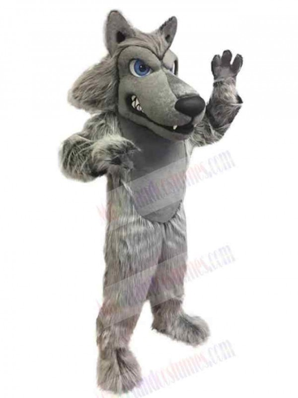 Fierce Grey Wolf Mascot Costume Animal with Blue Eyes
