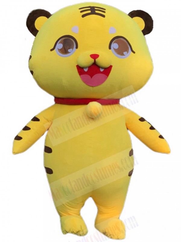 Big Mouth Yellow Tiger Mascot Costume with Yellow Bell Cartoon