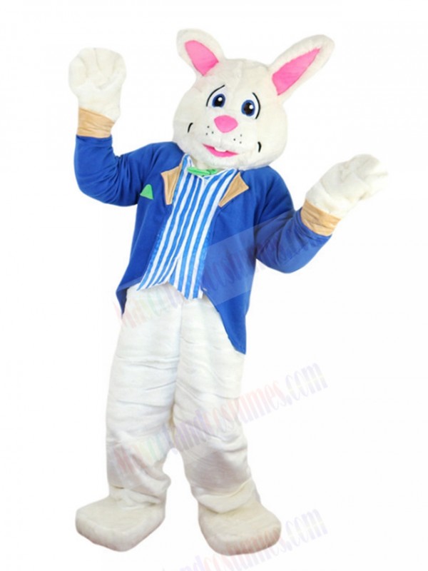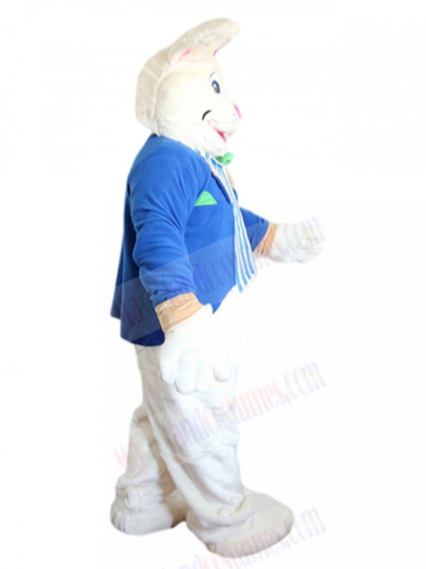 White Easter Bunny Mascot Costume in Blue Formal Suit Animal